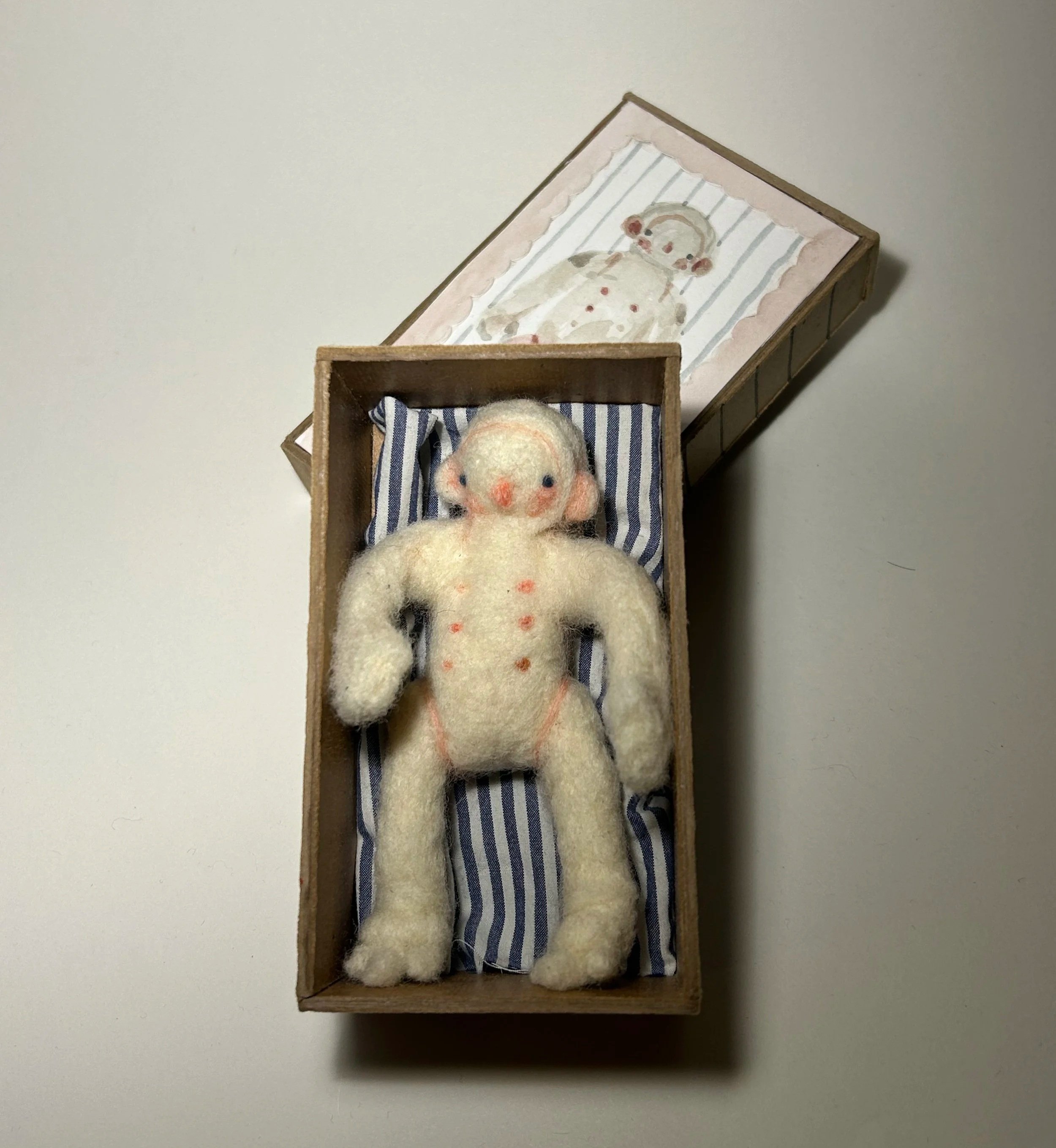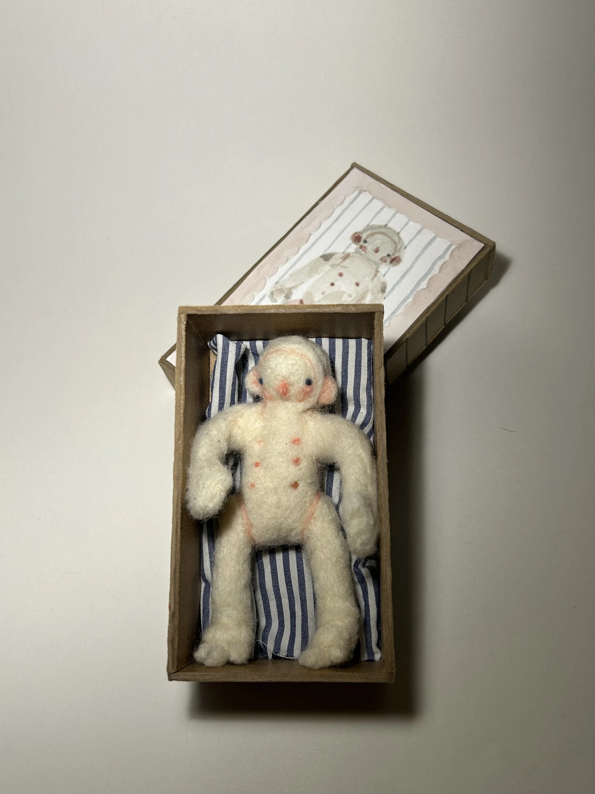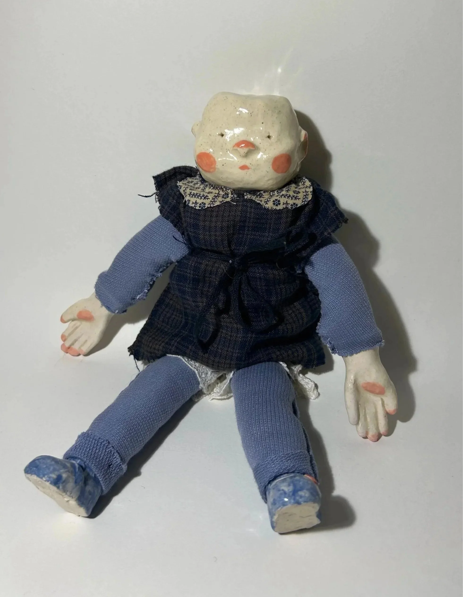 Doll, air dry clay, acrylic, found materials, 6”