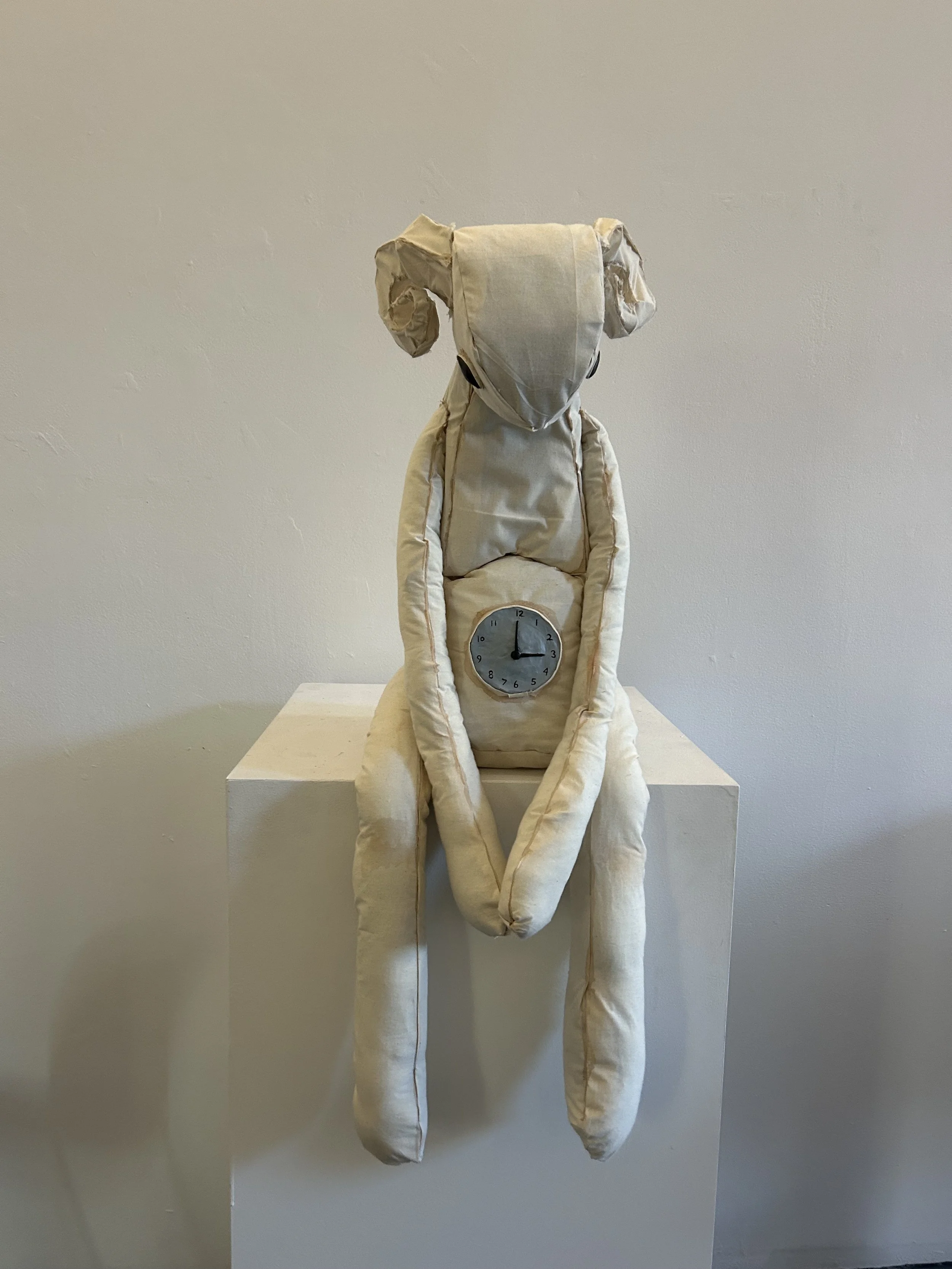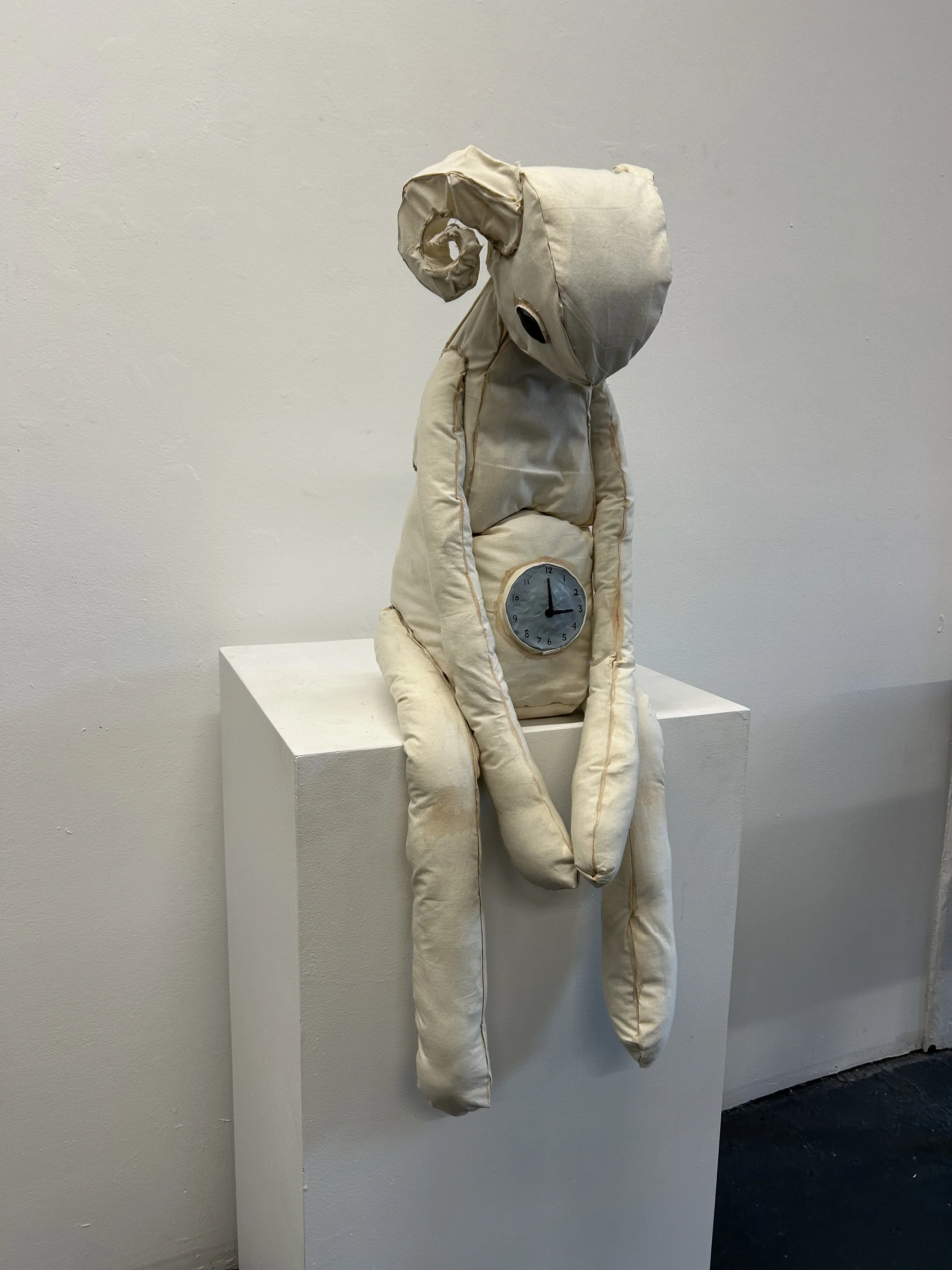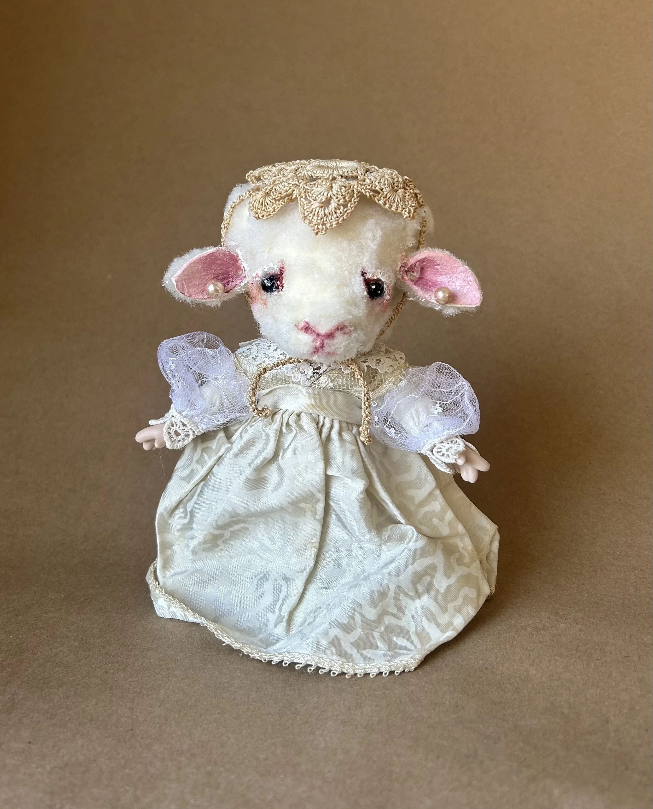 Lamb, air dry clay, acrylic, scrap fabric, 7”