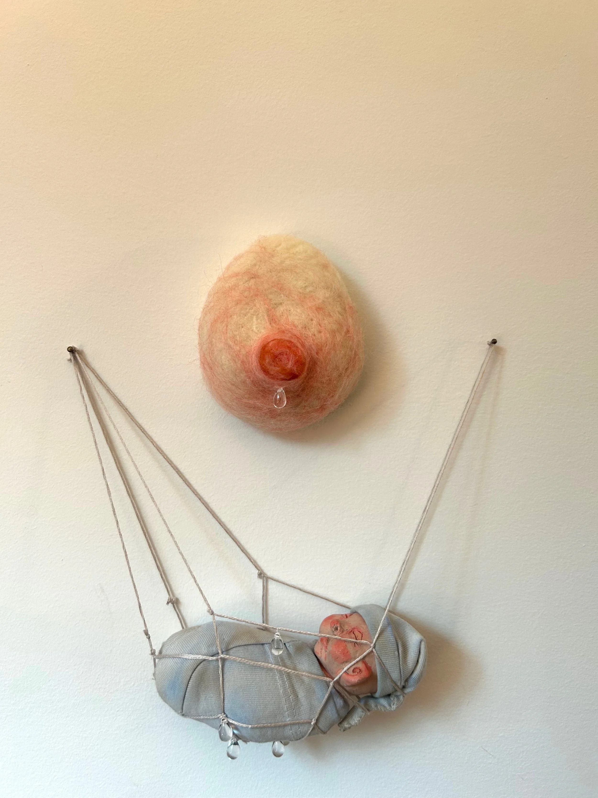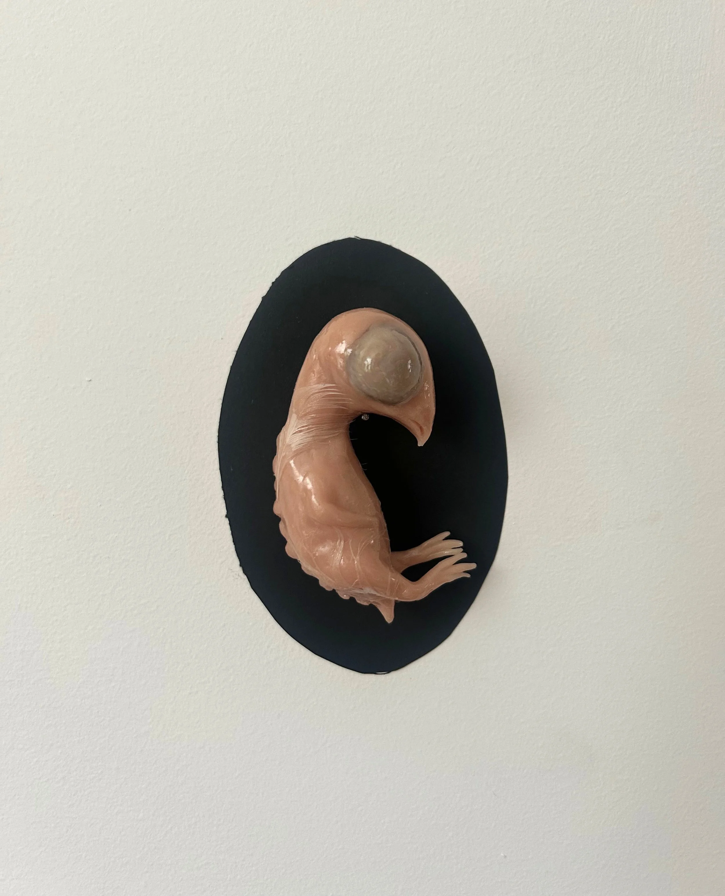 Embryo, sculpey, feathers, 3”x2”x1”