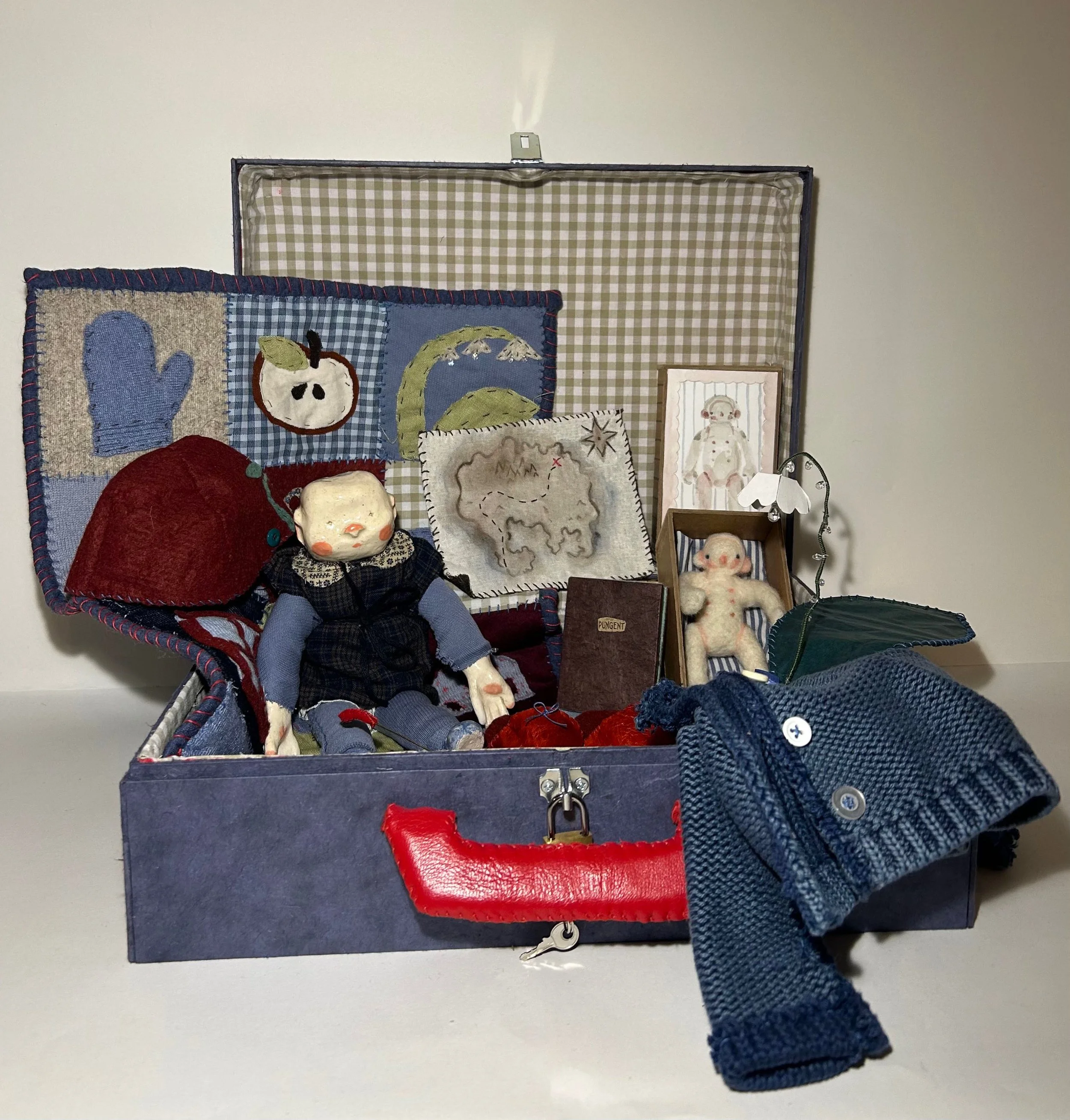 Suitcase of Mementos, fabric, book board, paper, mixed media, 12”x8”x10”